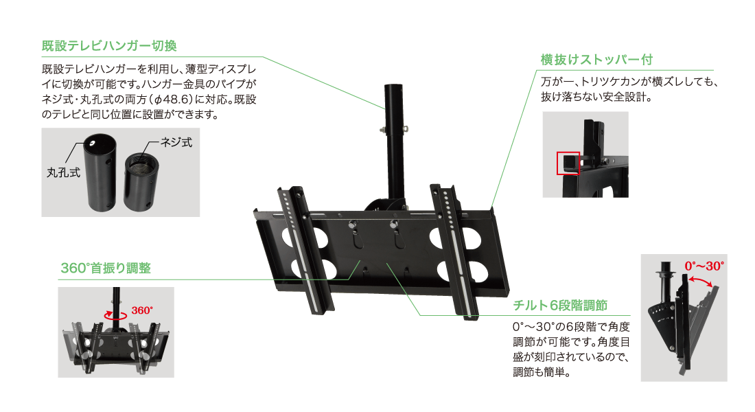 既設テレビハンガーを利用し、薄型ディスプレイに切換が可能です。ハンガー金具のパイプがネジ式・丸孔式の両方(φ48.6)に対応。既設のテレビと同じ位置に設置ができます。