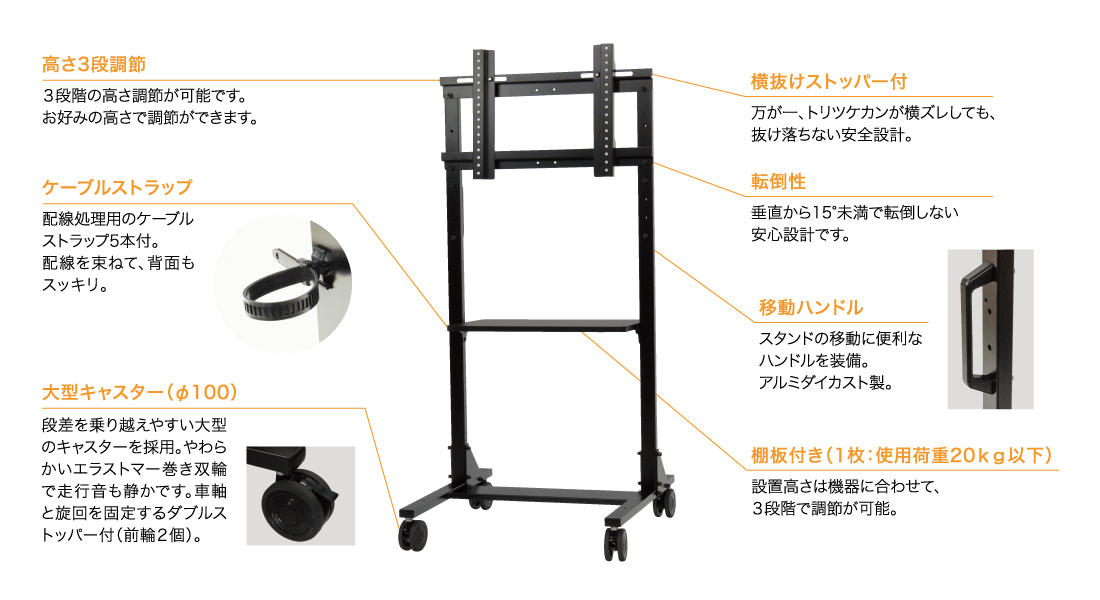 段差を乗り越えやすい大型のキャスターを採用。やわらかいエラストマー巻き双輪で走行音も静かです。車軸と旋回を固定するダブルストッパー付(前輪2個)。