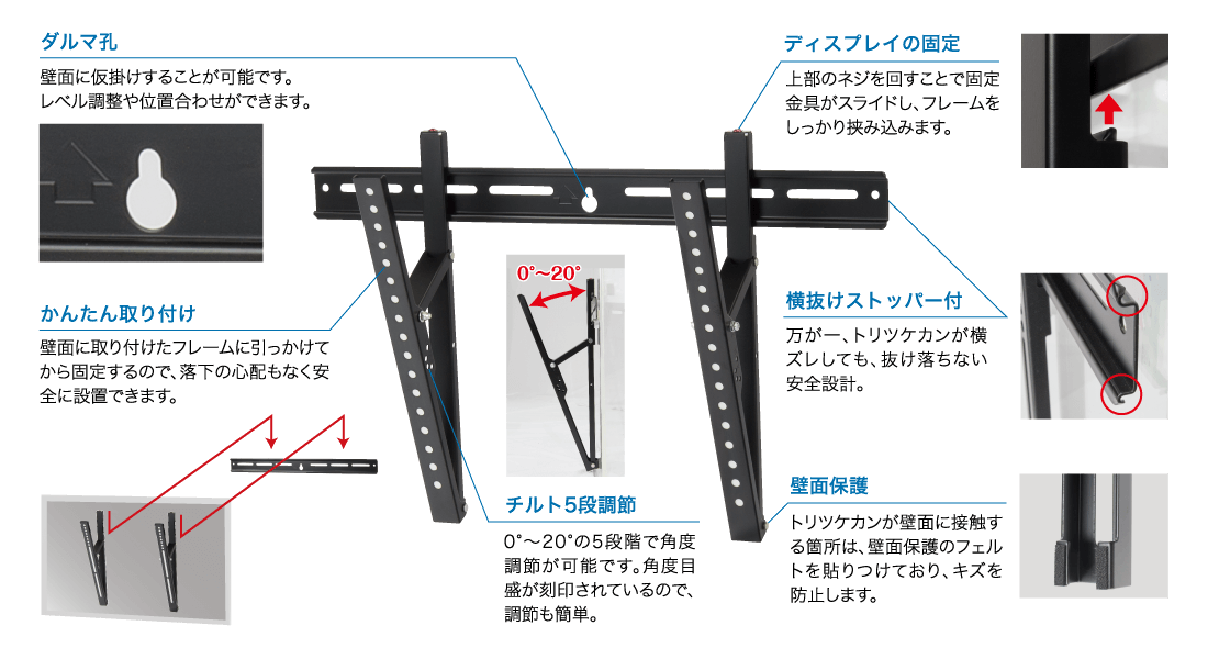 壁面に仮掛けすることが可能です。レベル調整や位置合わせができます。